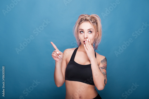 Beautiful young woman in sport outfit poiting and looking up with her eyes on blue background