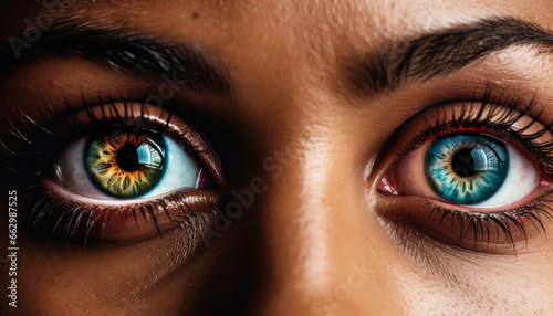 Beautiful young woman staring at camera with green eyes close up generated by AI