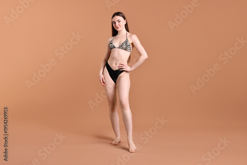 Beautiful young woman wearing stylish bikini on brown background
