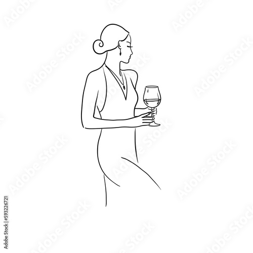 Beautiful young woman with a glass of wine. Stock illustration. Linear illustration.