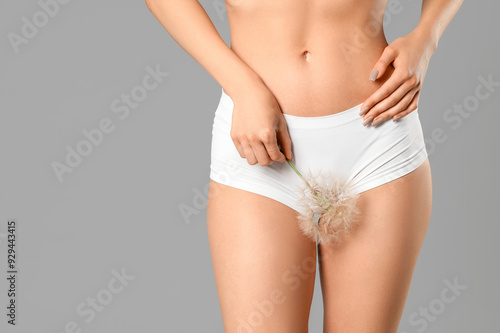 Beautiful young woman with white dandelion flower on grey background, closeup. Depilation concept