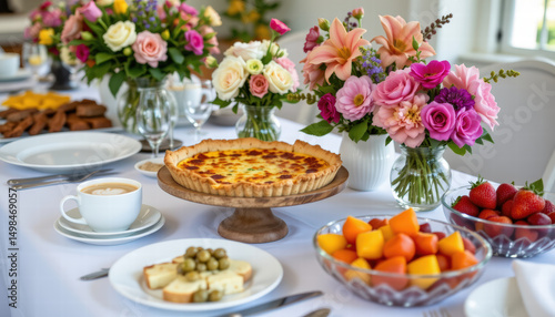 Beautifully arranged brunch buffet featuring variety of delicious foods, including savory quiche, fresh fruits, and elegant floral centerpieces that create warm and inviting atmosphere