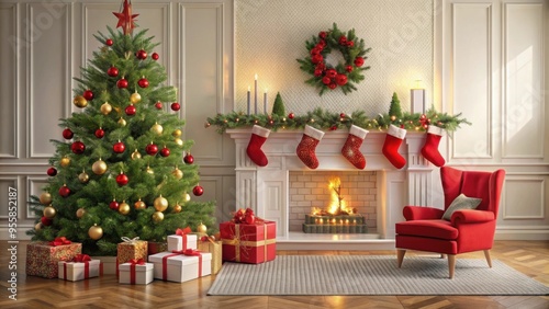 Beautifully decorated holiday room with Christmas tree, gifts, and red stockings, festive, home, cozy