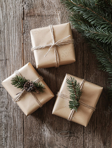 Beautifully Wrapped Gifts with Pine Branches on Rustic Wooden Table