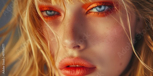 Beauty, A close-up of an orange eyeshadow and eyeliner makeup look with blonde hair.