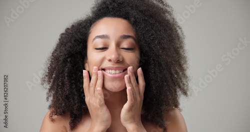 Beauty and healthcare concept - beautiful African American woman with curly afro hairstyle and clean, healthy skin touching face with hand, doing facial massage, posing and looking at camera