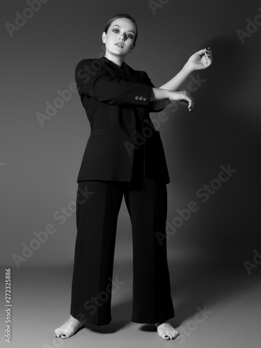 Beauty fashion girl with evening makeup . Black and white art photo . Elegant lady with stylish short hairstyle . Fashion full Portrait of a Beautiful Young Sexy Woman in Black Clothing