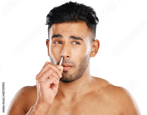 Beauty, hair and nose tweezers with man, wellness and skincare isolated on a transparent background. Person, model and guy with treatment, grooming routine and hygiene with png, health and pamper.