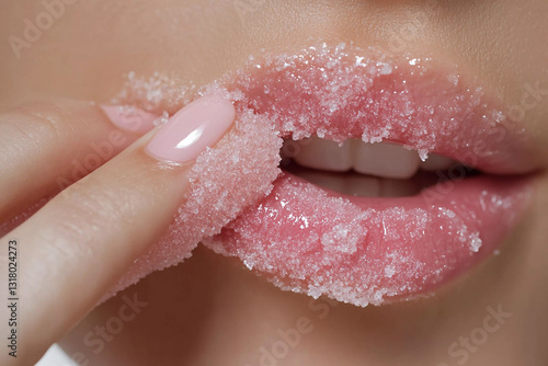 Beauty treatment with sugar scrub on lips for soft and smooth skin at skincare session