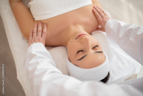 Beauty Treatments. Masseur Making Relaxing Massage To Attractive Indian Woman In Spa