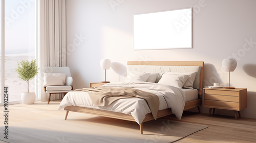 Bedroom picture canvas mockup. A modern, minimalist bedroom featuring big framed picture canvas mockup and a wooden bed with white bedding.