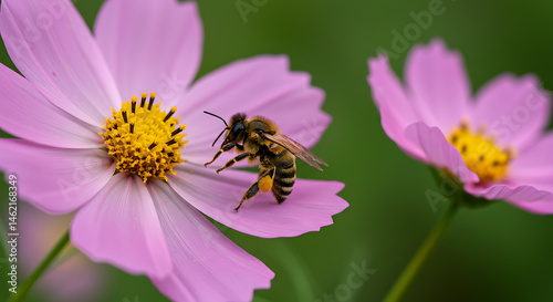 Bee Gathering Pollen from a Pink Flower in Garden