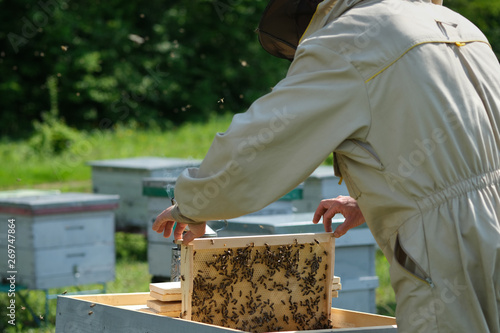 Beekeeper on apiary. Beekeeper is working with bees and beehives on the apiary.