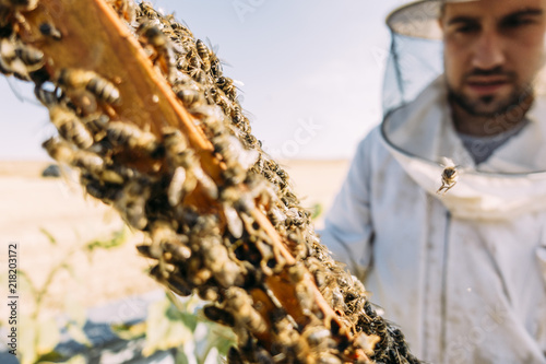 Beekeeper working collect honey