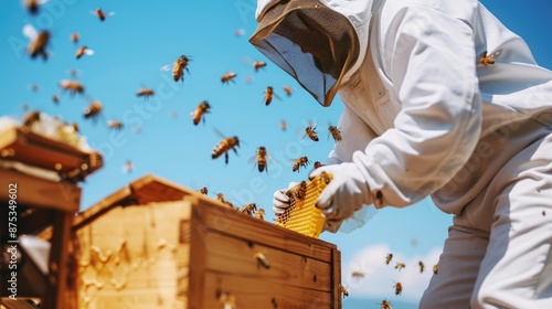 Beekeeping in action: Hive inspection on sunny day