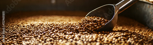 Beer malt poured in bulk with a scoop resting on the grains -