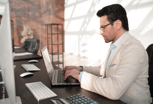behind the glass.serious businessman typing on a laptop