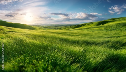 Behold serene expanse of a grassy meadow, adorned with a lush verdant carpet, where gentle sway of emerald blades whispers of unspoiled nature and purity, inviting one to bask in its tranquil embrace