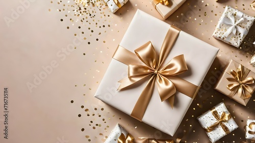 Beige and gold decorations, gifts, confetti for birthdays. An elegant background for holiday card.