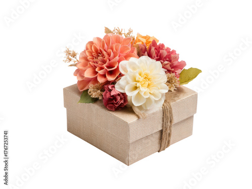 Beige box with coral peach pink flowers and twine gift floral, Isolated, Png Transparent Background