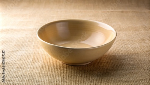 Beige ceramic bowl on beige cloth background in natural sunlight, worm's eye view