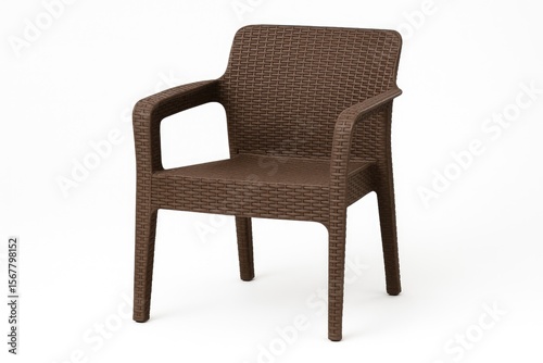 Beige synthetic wicker armchair with plastic supports on a plain white backdrop