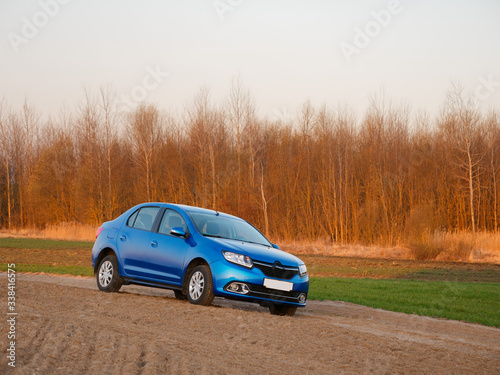 Belarus blue car in a field in spring at sunrise