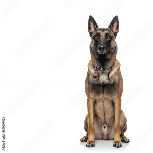 Belgian Malinois sitting calm but vigilant, guard expression, isolated minimal background