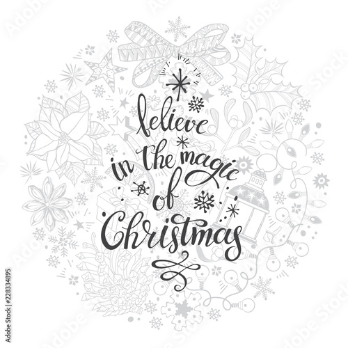 Believe in the magic of Christmas. Vector hand written calligraphic phrase in the shape of a circle with traditional festive elements.