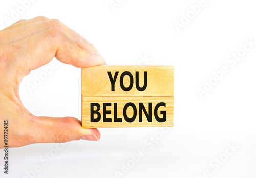 Belonging and you belong symbol. Concept words You belong on beautiful wooden blocks. Beautiful white background. Businessman hand. Business belonging and you belong concept. Copy space.
