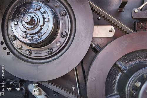 Belt drive with automatic belt tensioning mechanism. Fragment of a combine harvester