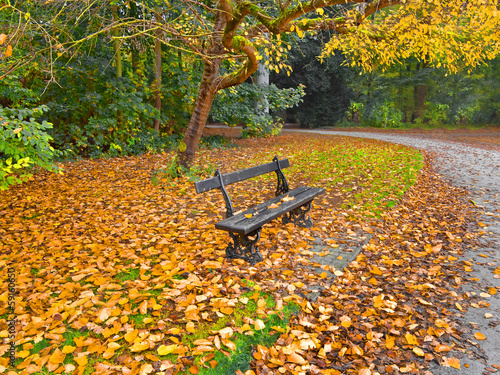 Bench in autumn park. Autumn landscape.