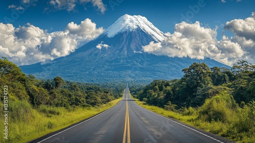 Beneath a vibrant blue sky, a prominent volcano towers over a winding road lined by verdant foliage. The majestic peak is capped with snow, inviting awe and adventure in nature's embrace