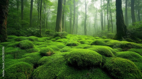 Beneath the towering trees, a vibrant blanket of moss covers the forest floor, inviting exploration.