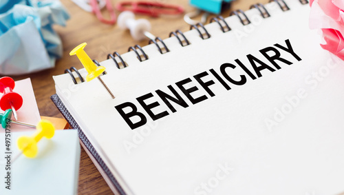 BENEFICIARY word in a notepad on wooden desk with crumpled paper and paper needles around.