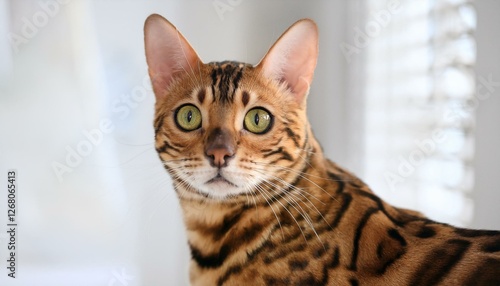bengal cat looking at camera closeup portrait white home background