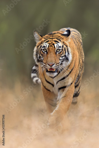 Bengal tiger (Panthera tigris) male walking, portrait. Ranthambhore National Park, India.