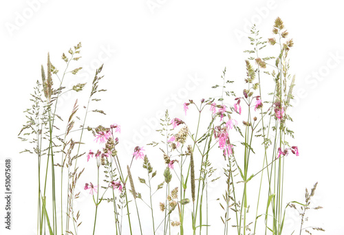 Bent grasses and wild meadow pink cornflowers isolated on white background. Abstract fresh wild grass flowers, herbs.