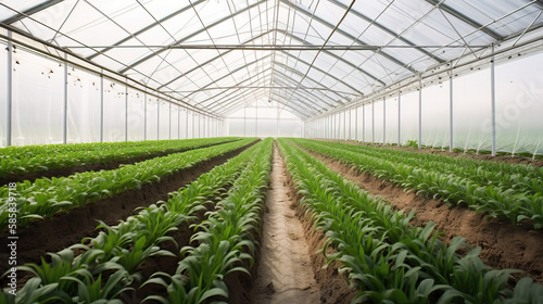 Bepflanzte Ackerfläche in einem Gewächshaus (Generative AI)