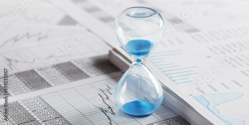 Best time for investment. Hourglass, financial charts and calculator.