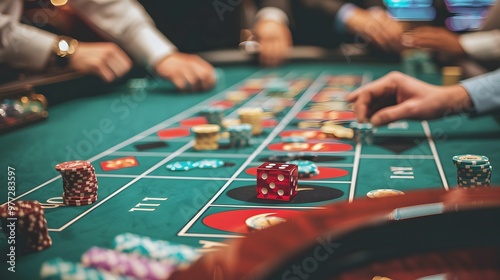 Betting Chips on Craps Table: Hands placing a bet on the craps table, dice ready to be rolled and chips in place.
