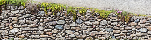 bewachsene Mauer mit Wackersteinen