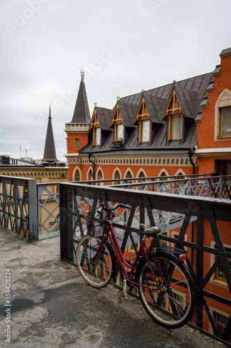 Bicicleta y casa de colores en Copenhague, Dinamarca.