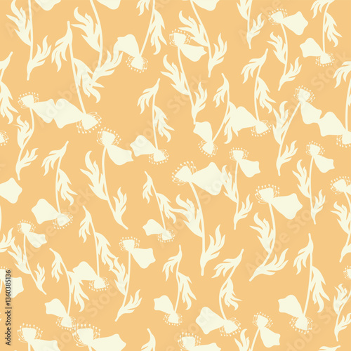 Bicolor contour silhouette seamless pattern with poppy flowers and leaves. Abstract floral spring, summer pastel pattern