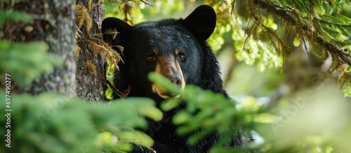 Big black bear trapped in tall evergreen tree.