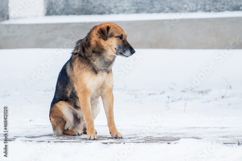 Big brown dog in the winter sitting in the snow