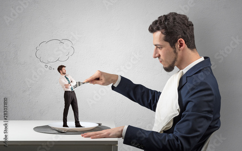 Big businessman want to eat small man with cloud messages above his head