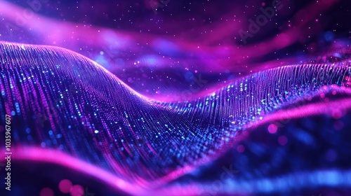 Big data visualization. The musical stream of sounds. Abstract background with interweaving of dots and lines. Blue and purple technology, speed, Internet background
