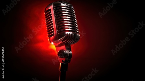 Big diaphragm mic for podcast against a black backdrop with red lighting.