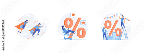 Big discount, Woman sitting in trolley and shopping online, buy on discount sales. Big discount set flat vector modern illustration